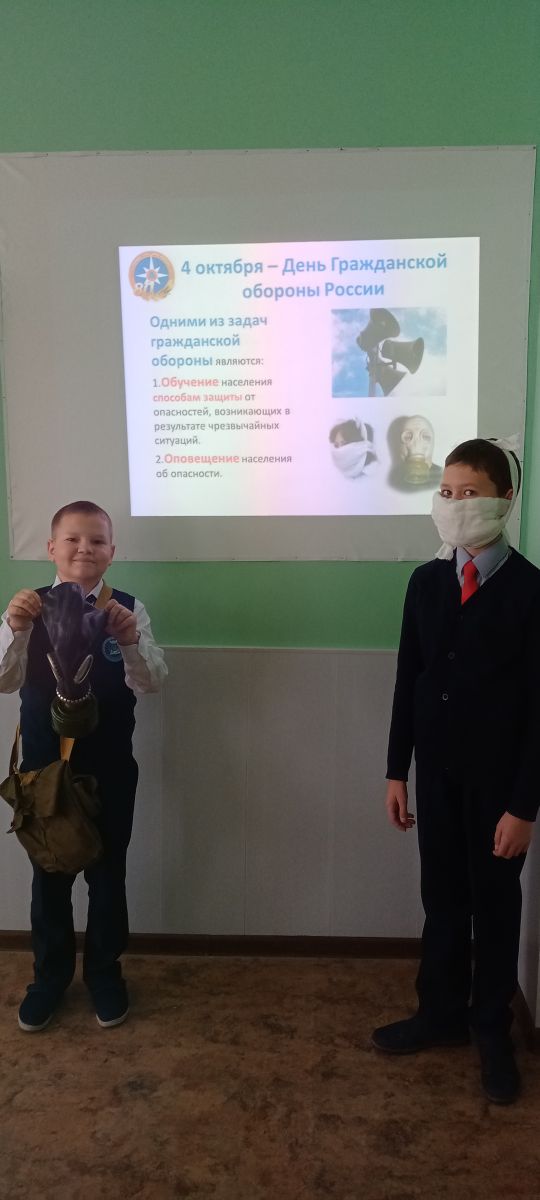 29 сентября в 4б классе (кл. руководитель Гараева З.М.) прошел Всероссийский открытый урок по ОБЖ, приуроченный ко Дню гражданской обороны РФ. На данном уроке дети познакомились с историей возникновения Гражданской обороны в России, функциями Гражданской обороны, с руководителями ГО, с задачами ГО, с сигналами ГО и действиями населения в военное и мирное время. Также прошла практическая отработка навыков безопасного поведения учащихся в различных ЧС.