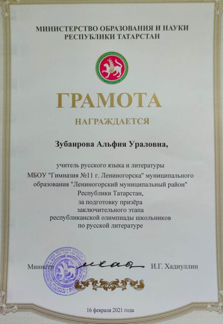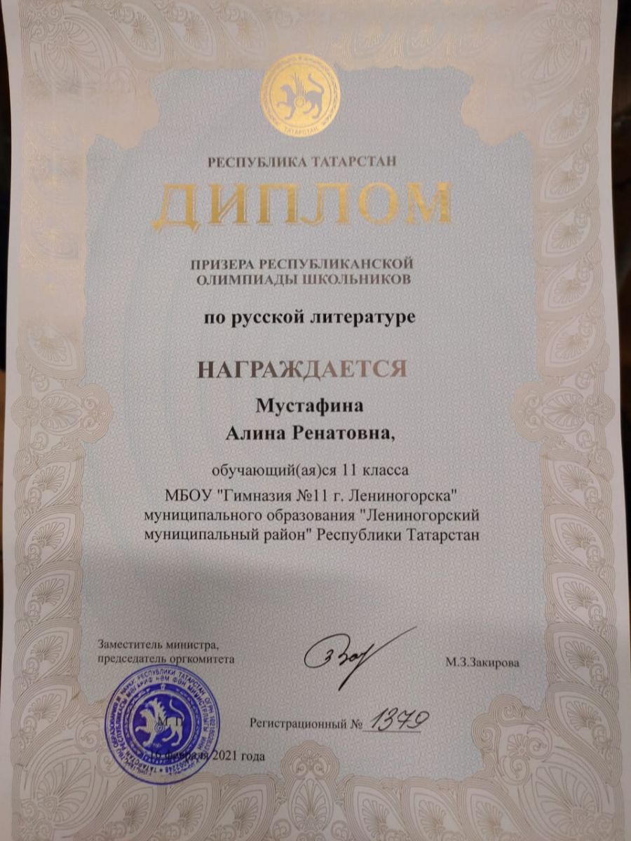 Поздравляем ученицу 11 класса Мустафину Алину и её наставницу Альфию Ураловну Зубаирову с победой на республиканском этапе Всероссийской олимпиады школьников по русской литературе. Молодцы!