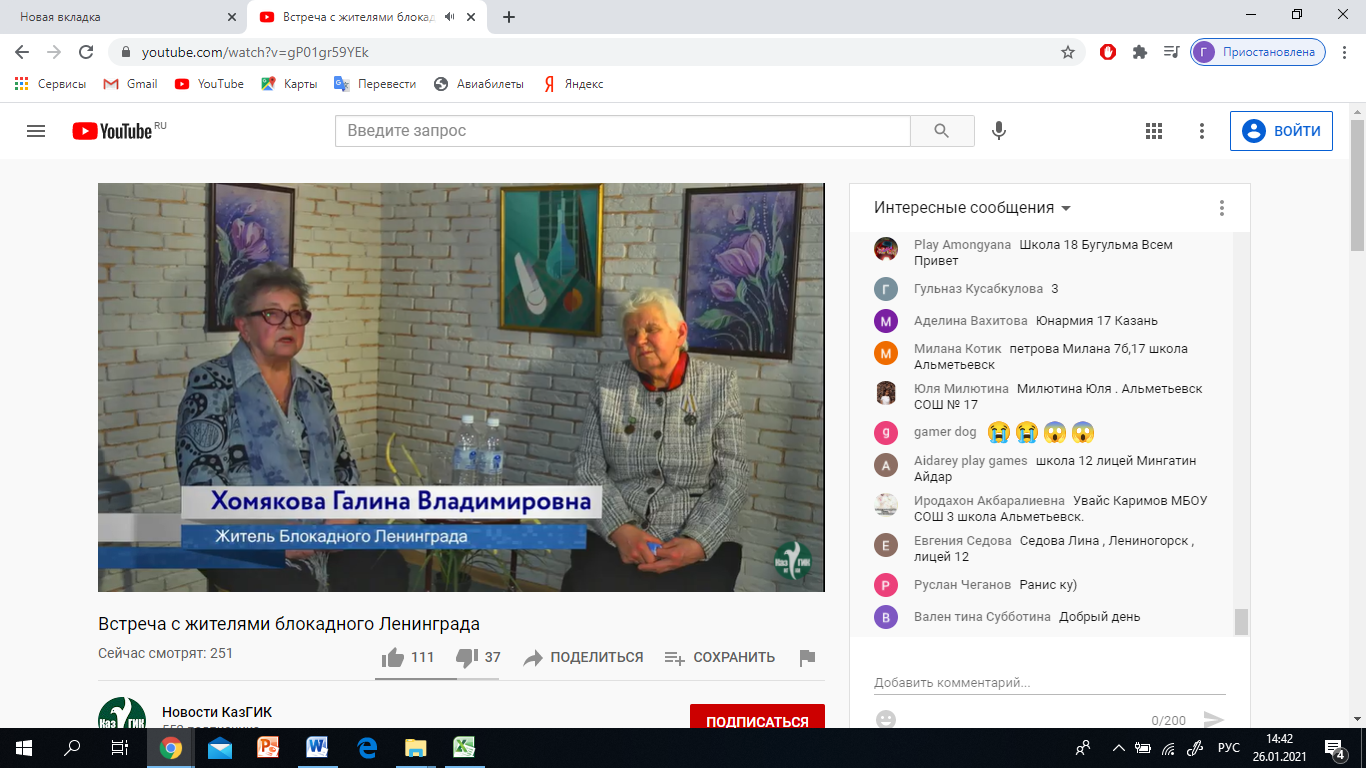 26 января в режиме онлайн на платформе Ютуб прошла встреча с жителями Блокадного Ленинграда Бушевой Зинаидой Григорьевной и Хомяковой Галиной Владимировой, в которой учащиеся Гимназии приняли активное участие. Зинаида Григорьевна и Галина Владимировна рассказали ребятам истории о тяжелых днях Блокады, как они выживали, помогали друг другу.