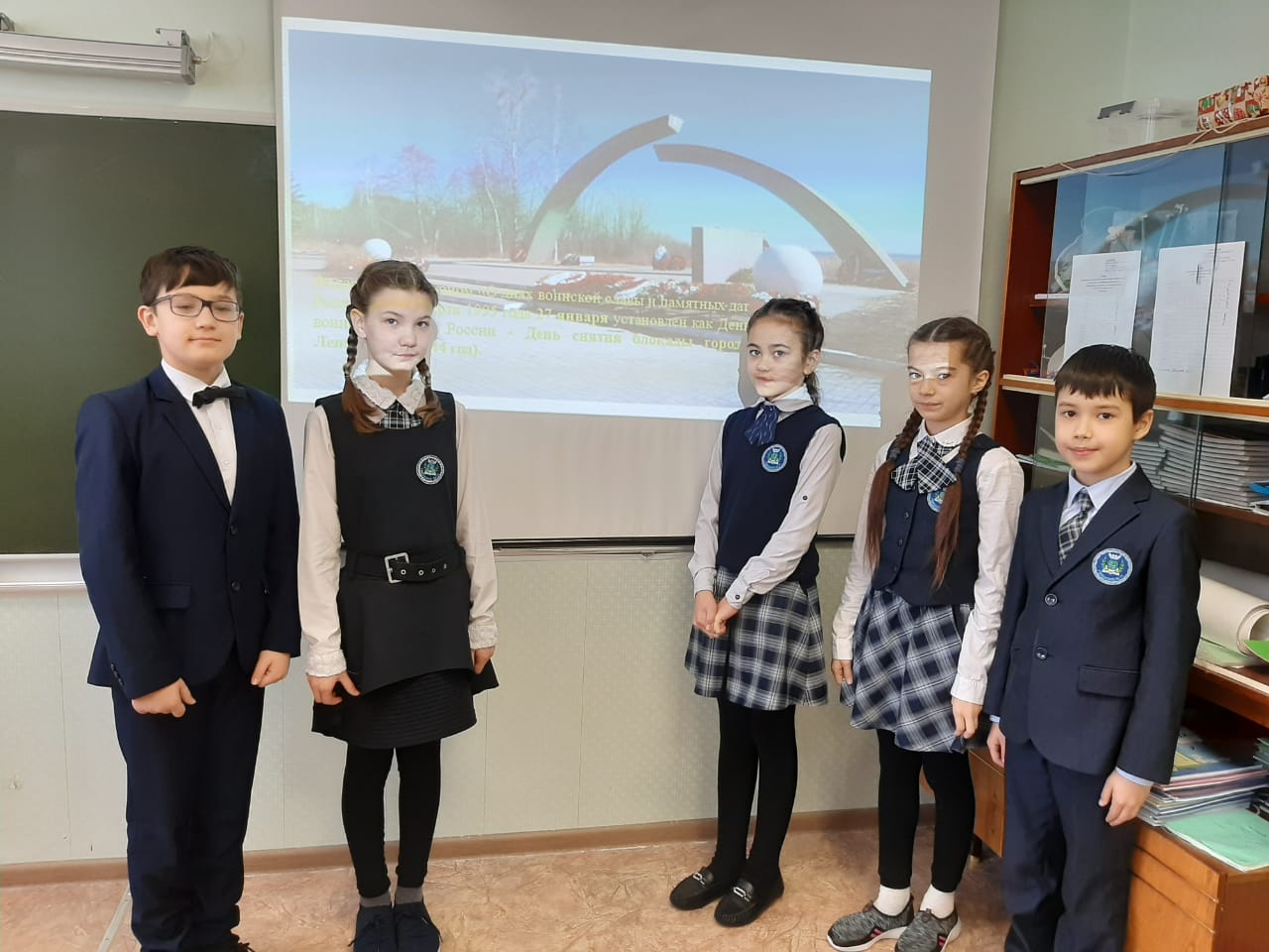 В конце классного часа ученики с классным руководителем почтили память жителей Ленинграда, отстоявших его и не доживших до наших дней, минутой молчания.