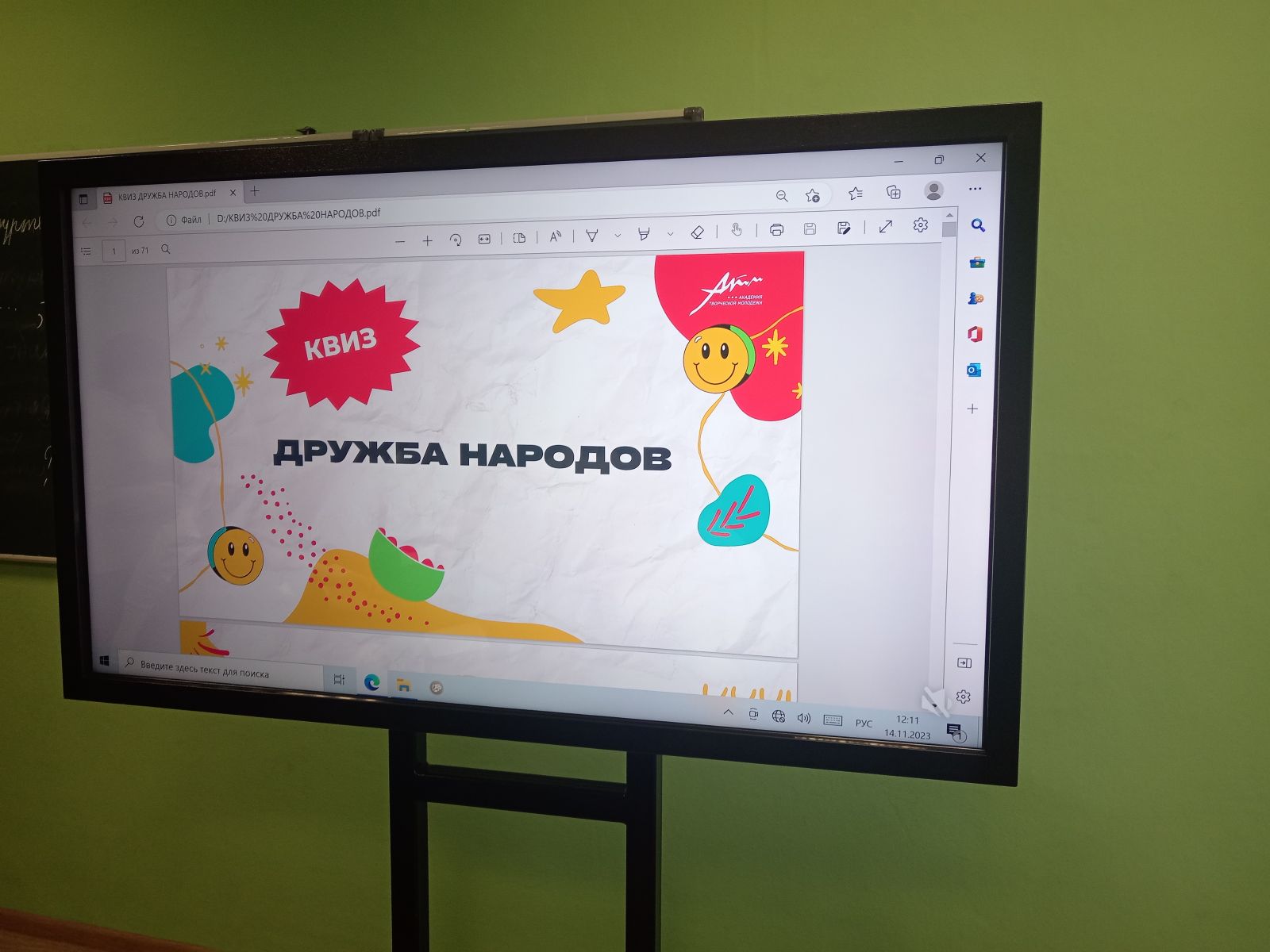 14 ноября для обучающихся 8 «В» советник директора Насырова Л.И. провела квиз-викторину приуроченную ко Дню народного единства. Квиз-викторина состояла из трех раундов - "Народная мудрость", "Угадай мелодии", "Национальные блюда". В мероприятии соревновались две команды. Ребятам очень понравилась эта игра, они узнали много нового и интересного. В викторине победила дружба!