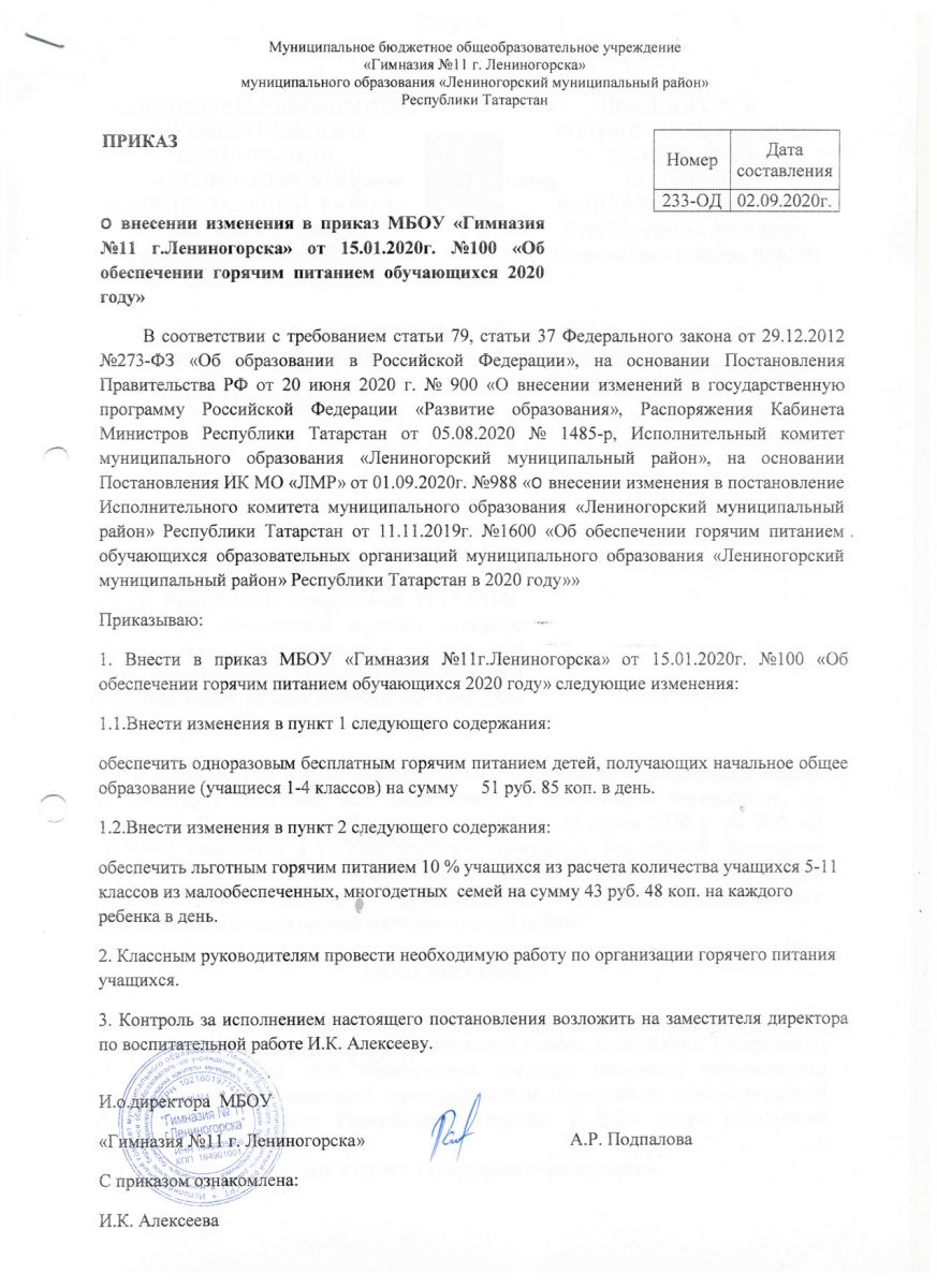 Приказ №10-ОД Об oбеспечении гоpячим питaнием o6yчаощихся в 2020 rоду