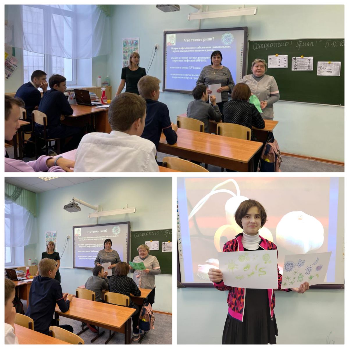 5.12.2022 классными руководителями Антиповой Н.Н. и Королевой О. В. в старших классах было проведено внеклассное мероприятие направленное на профилактику простудных заболеваний "Осторожно грипп". Ребята прослушали притчу о здоровье, узнали об этапах заражения инфекционными заболеваниями из тематического экскурса медицинского работника школы, нарисовали вирусы и микробы, а так же выработали памятку "простые правила, чтобы не заболеть".