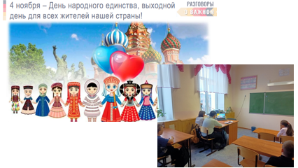 В рамках урока «Разговор о важном», учащиеся 5 класса послушали информацию о происхождении праздника «День народного единства». Посмотрели видеоролик о простом человеке Кузьме Минине и князе Дмитрии Пожарском, о том где стоит памятник. Узнали информацию об иконе Казанской Божьей матери и о Казанском соборе построенном и названым в честь иконы.