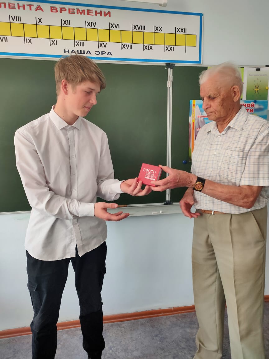 Школьному музею Н. Н. Степанов подарил медаль к 100 летию образования ТАССР.