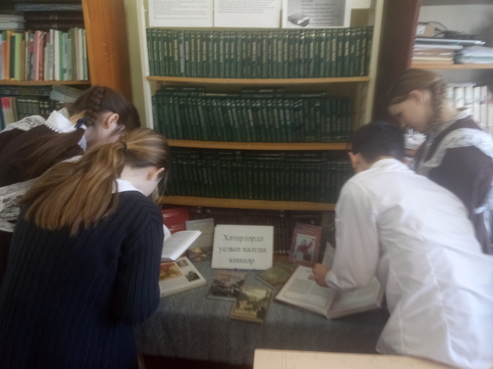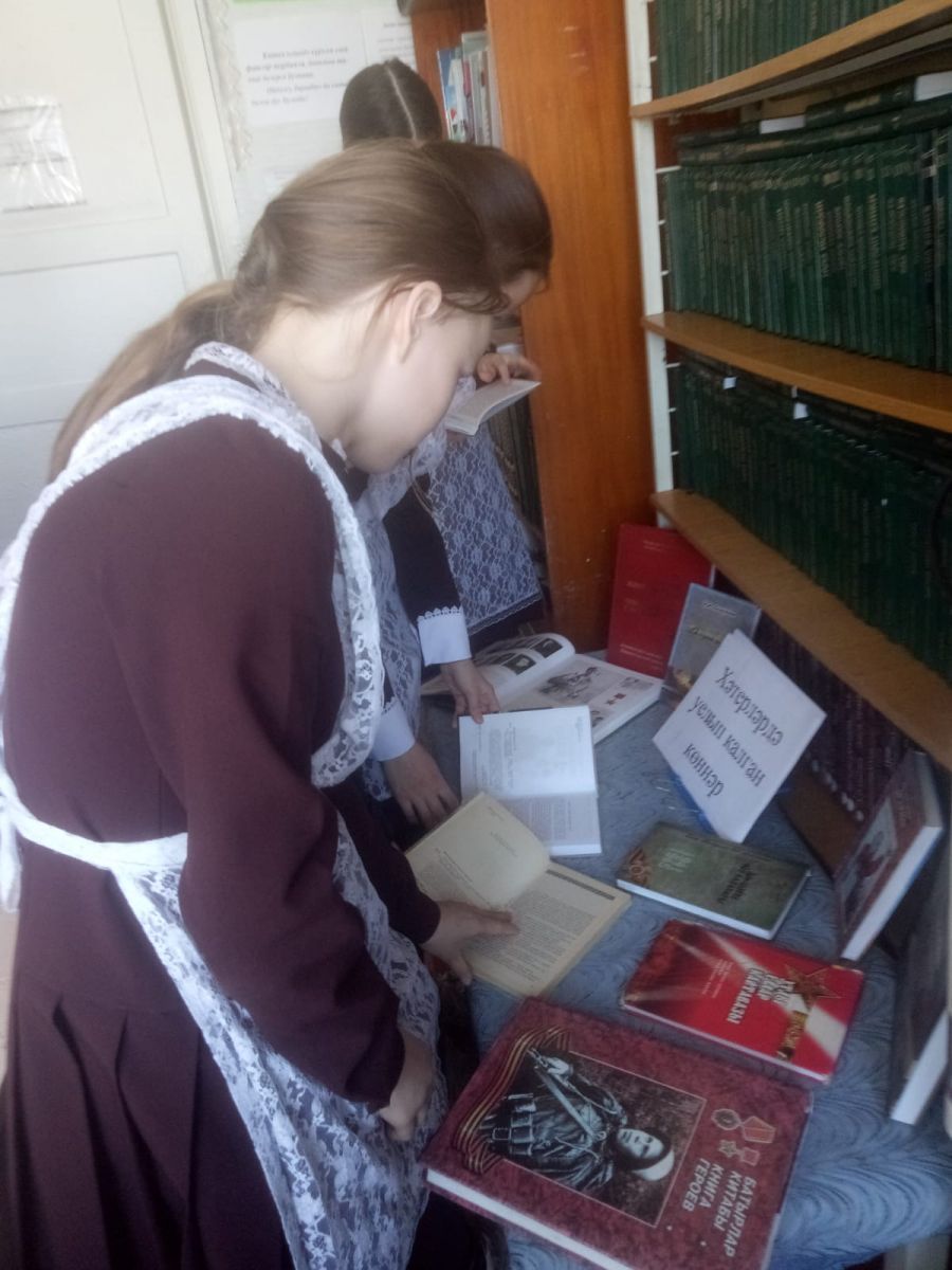 Сегодня ученики 6-го класса ознакомились с книжной выставкой "Хәтерләрдә уелып калган көннәр". Они узнали о беззаветном героизме, подвигах нашего народа времен Великой Отечественной войны. Провели игру-викторину.