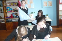 "Зәңгәр яулык" акциясендә катнашып 9 класс укучылары сугыш һәм тыл ветераннары хөрмәтенә зәңгәр яулыклар әзерлиләр. Бүген педагог-оештыруча Әскәрова Ф.Ә. җитәкчелегендә 8 яулык тегелде. Яулыкларга Тынычлык символы булган күгәрчен рәсеме төшерелде.