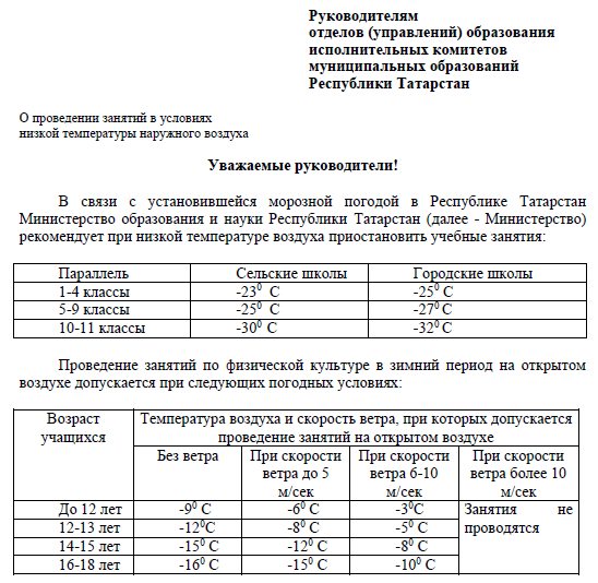 Документ: О проведении занятий в условиях низкой температуры наружного воздуха