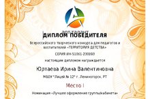 В мае проходил Всероссийский творческий конкурс «Территория детства». Кабинет начальных классов № 7 нашего лицея (учитель Юртаева И.В.) занял I место в номинации «Лучшее оформление кабинета».