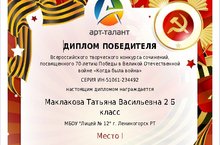 Ученица 2 Б класса Маклакова Татьяна (учитель Юртаева И.В.) заняла I место во Всероссийском творческом конкурсе сочинений, посвящённом 70-летию Победы в Великой Отечественной войне «Когда была война».