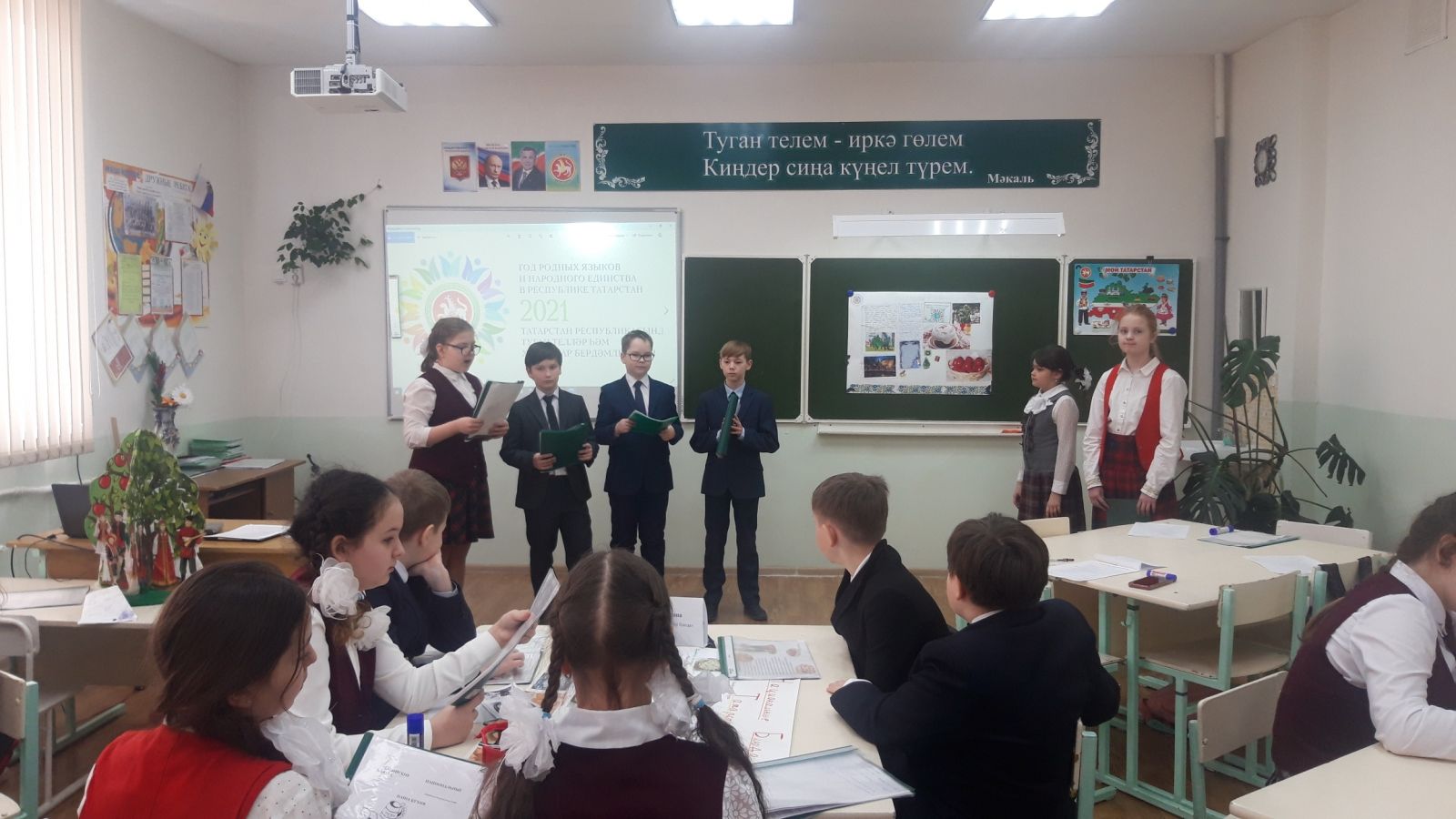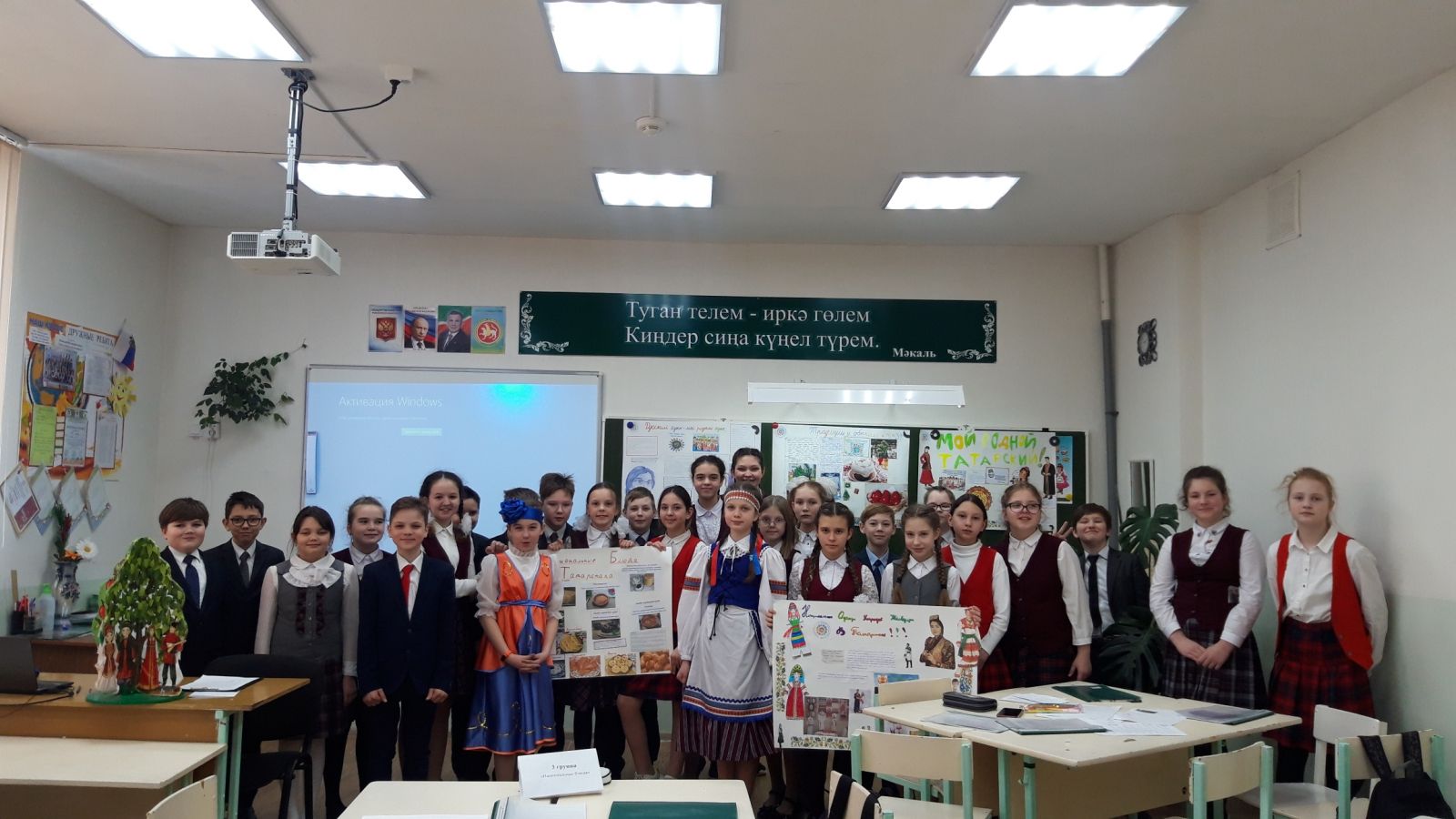 Татарстан Республикасы-күп милләтле республика, аның территориясендә инде күп гасырлар дәвамында төрле халыклар һәм этнослар тату яши. Милли үзенчәлекне саклап калу һәм халыклар арасында мәдәни элемтәләрне ныгыту мәсьәләсе хәзерге вакытта бик актуаль. Татарстан Республикасы территориясендә яшәүче барлык милләтләрнең үзенчәлеген саклап калу өчен, иң беренче чиратта яшь буынга мәдәни хәтер, милли мохитнең әхлакый нормаларын сеңдерергә кирәк. Барлык бу мәсьәләләр 7 нче сыйныфта (сыйныф җитәкчесе – Егорова Е. Н.) төркем проектларын яклауда каралды, ул туган телләр һәм Халык бердәмлеге елына багышланган иде.