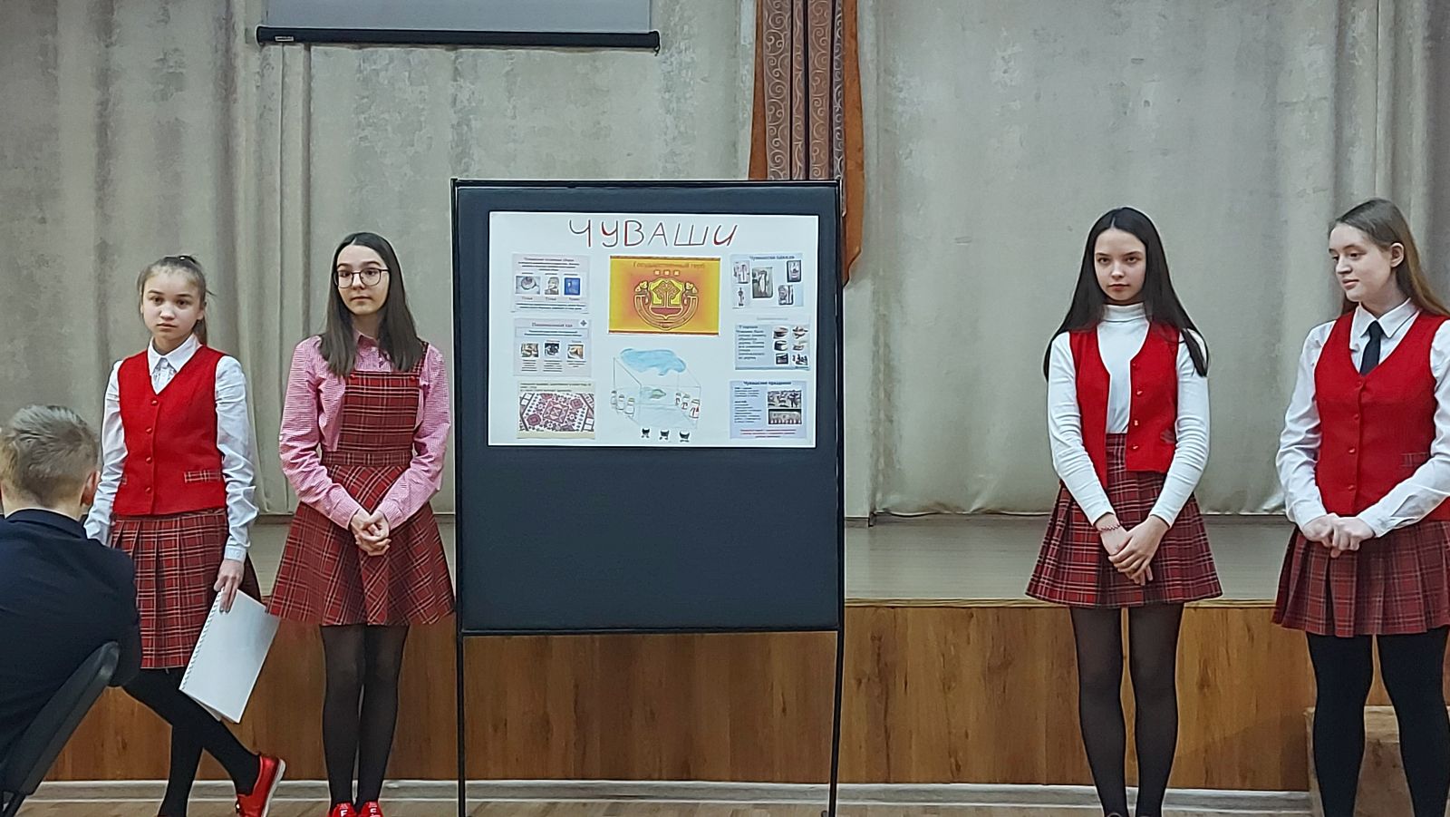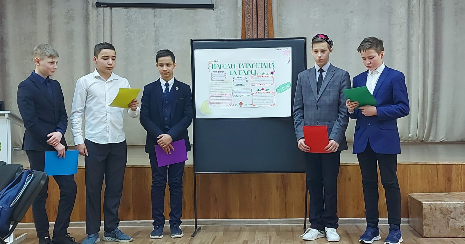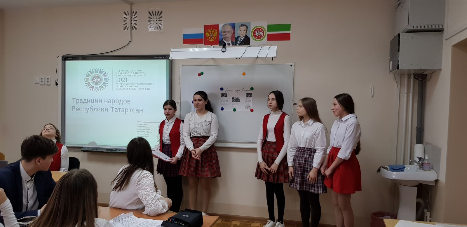 Республика Татарстан – это многонациональная республика, на территории которой уже на протяжении многих столетий мирно проживают разные народы и этносы. Вопрос сохранения национальной самобытности укрепления культурных связей между народами чрезвычайно актуален в наше время. Необходимо прививать культурную память, моральные нормы национальной среды в первую очередь молодому поколению, чтобы сохранить самобытность всех национальностей, проживающих на территории Республики Татарстан. Все эти вопросы были рассмотрены на защите групповых проектов в 7 классе (классный руководитель – Егорова Е. Н.), которая была посвящена Году родных языков и народного единства.