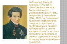 Русский народ поздно вступил на путь математического творчества, но уже первый шаг на этом пути оказался очень крупным. И этот шаг был сделан Н.И. Лобачевским. Именно за ним утвердилось имя «Коперник геометрии».