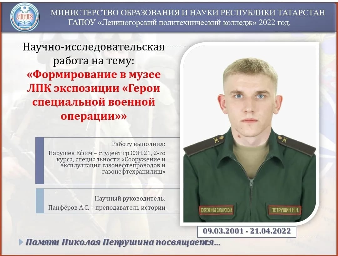 В своей работе он представил доклад о том, как поисковый отряд во главе с преподавателем истории Панферовым А.С. составили биографию и подготовили стенд в музее ЛПК, увековечив память о герое специальной военной операции – Николае Петрушине, выпускнике @len_polytechnic_college
