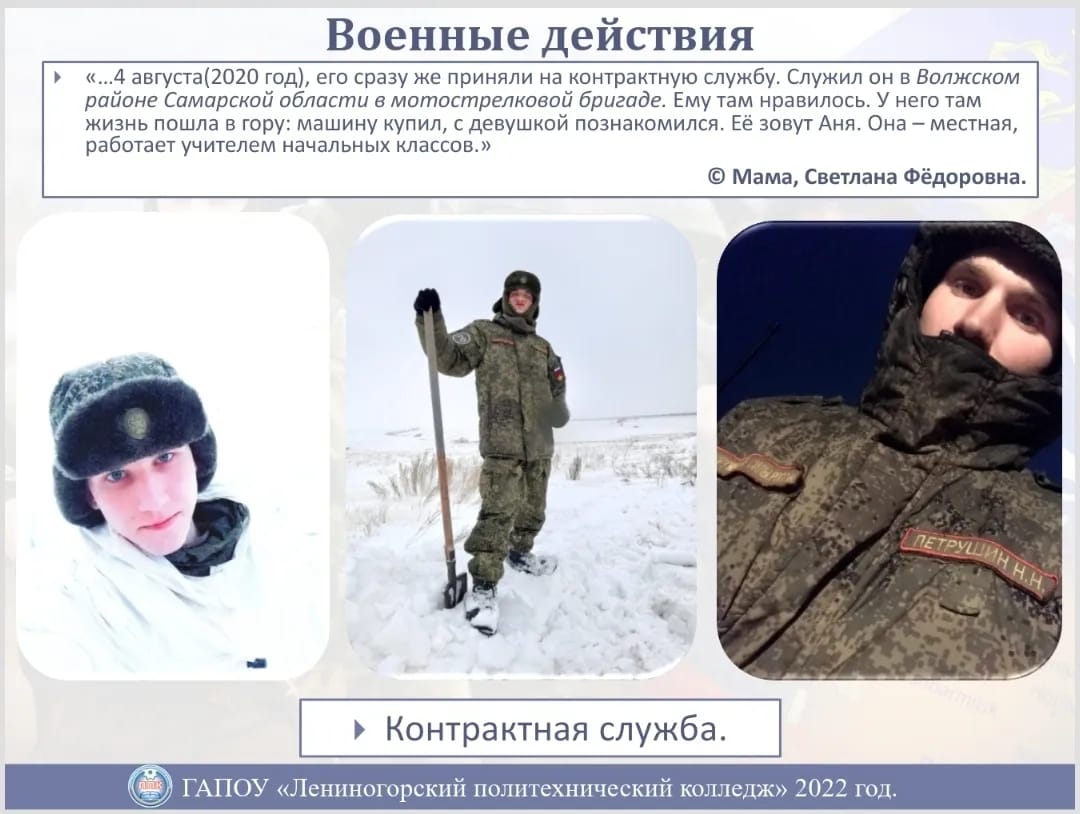 "Мы считаем, что это достойное действие для воспитания патриотизма в подрастающем поколении – студентах колледжа. Пока не ясны некоторые детали нахождения Петрушина на Украине, обстоятельства его гибели, ход специальной военной операции в целом. Поэтому составленная нами биография ограничена. В дальнейшем мы планируем дополнить биографию, дополнить музейный стенд, издать брошюру воспоминаний о Петрушине Н."- из выступления Нарушева Ефима