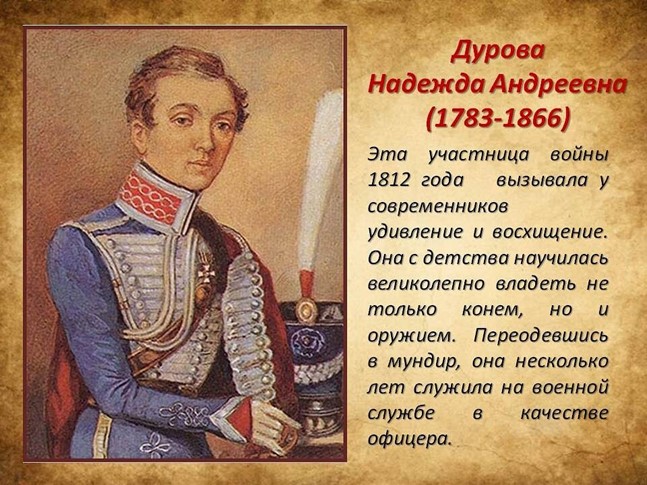 Надежда Андреевна Дурова – первая в России женщина-офицер («кавалерист-девица»), писательница.