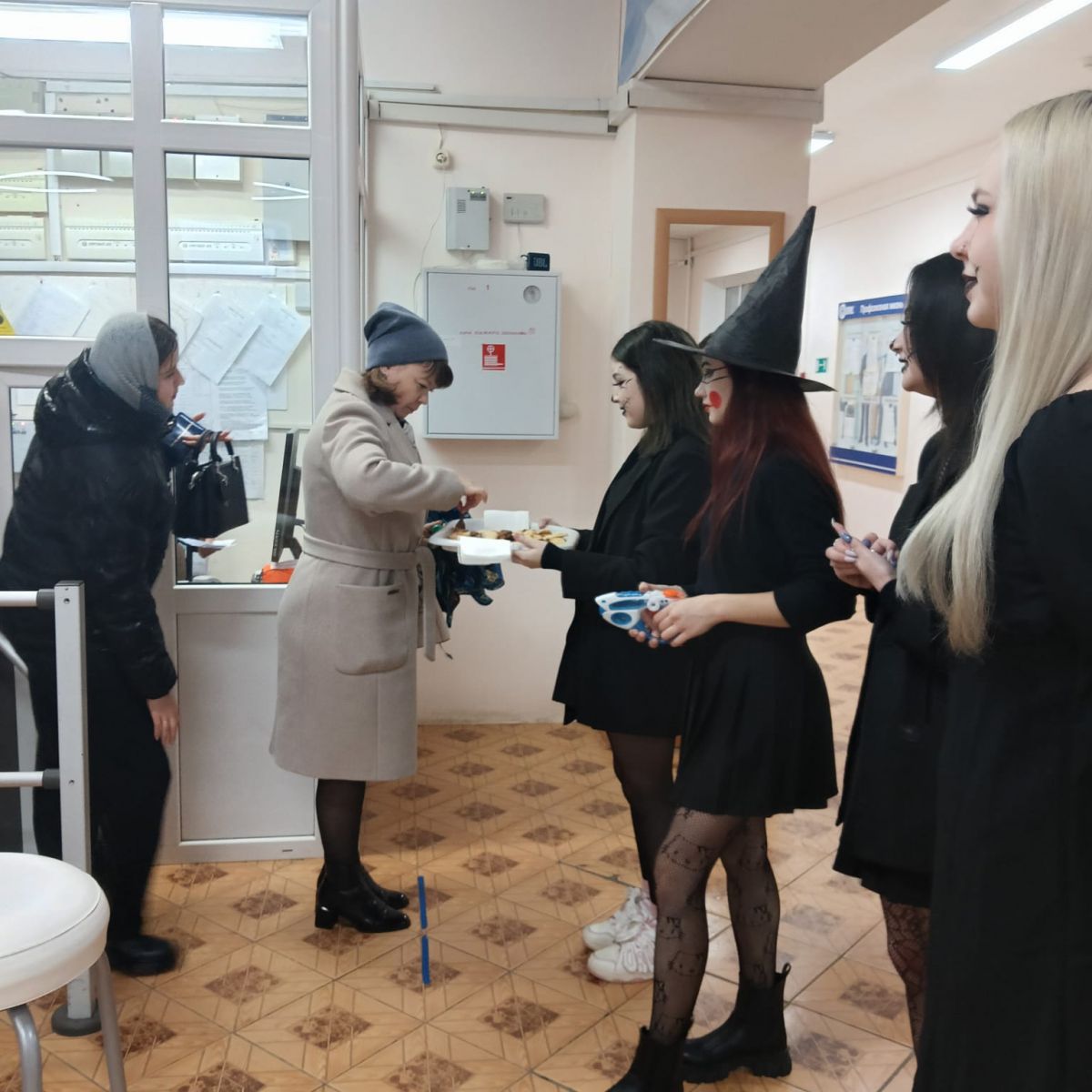 31 октября в колледже началось с костюмированной встречи! Студентов и преподавателей встречали персонажи Хеллоуина. Они угощали всех входящих печеньем, испеченным студентами нашего колледжа под руководством Ваструковой Н. И., в стиле праздника "Хеллоуин".