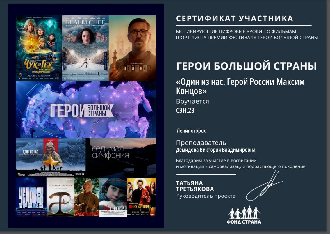 10 фильмов -номинантов премии "Герои большой страны" теперь смогут посмотреть и обсудить во время классных часов студенты Колледжа.