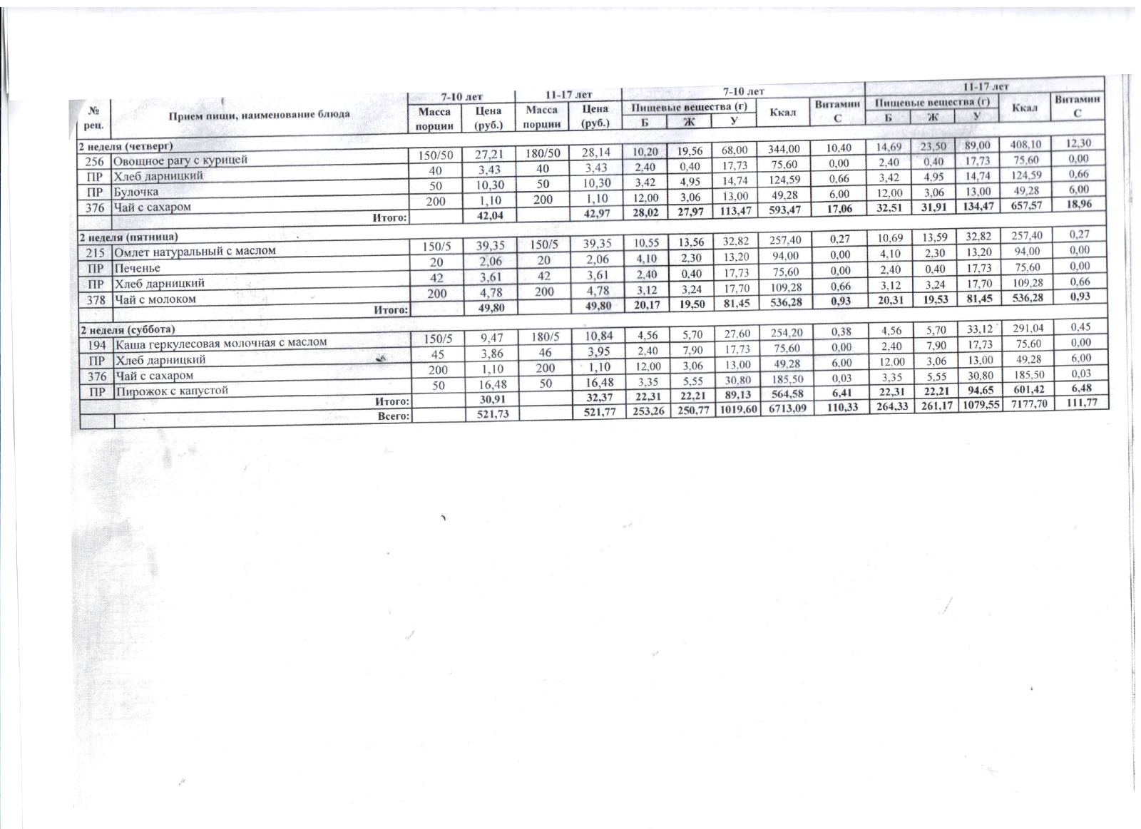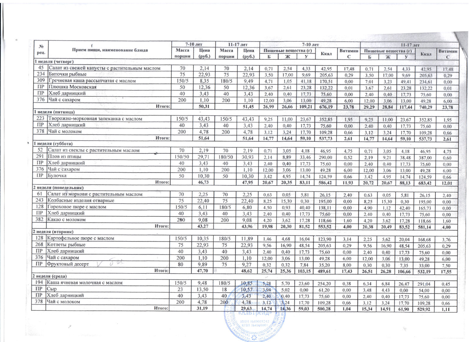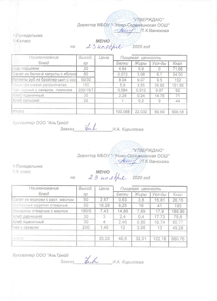 Двухнедельное меню на ноябрь 2020г. для 5-9 кл.