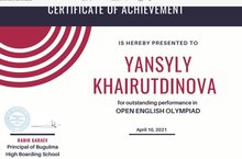 10 апреля ученица 6 класса Хайрутдинова Я.С. впервые приняла участие в зональной олимпиаде по английскому языку, где показала хорошее знание английского языка.(Руководитель Зиятдинова А.Ф). Надеемся что, Янсылу в следующей олимпиаде завоюет первое место. Желаем удачи!