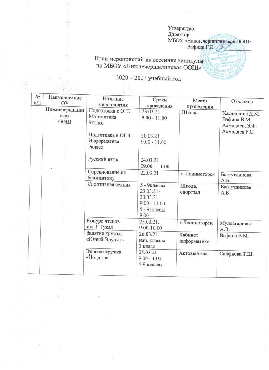 План мероприятий для обучающихся на весенние каникулы 20.03.2021