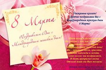 Дорогие наши мамы! Поздравляем вас с вашим праздником 8 Марта. Желаем вам всего самого наилучшего и главное быть всегда самымыи красивыми. Счастья вам дорогие наши мамы!!!!!!!!!!