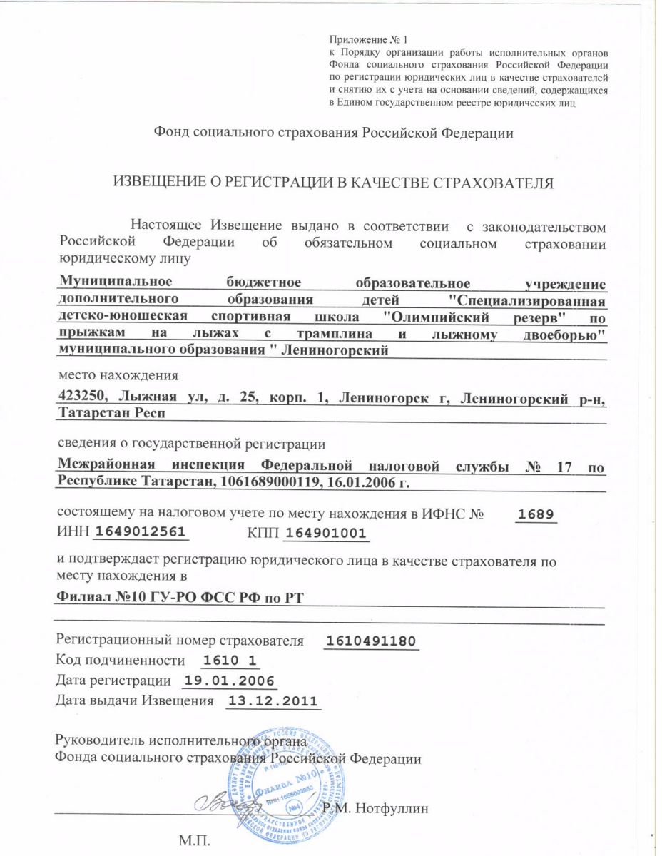 ИЗВЕЩЕНИЕ О РЕГИСТРАЦИИ В КАЧЕСТВЕ СТРАХОВАТЕЛЯ (ФСС РФ)
