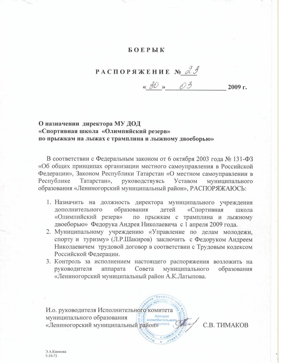 РАСПОРЯЖЕНИЕ ИСПОЛНИТЕЛЬНОГО КОМИТЕТА МУНИЦИПАЛЬНОГО ОБРАЗОВАНИЯ О НАЗНАЧЕНИИ ДИРЕКТОРА УЧРЕЖДЕНИЯ