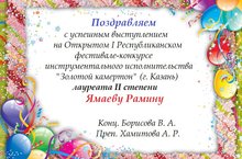 Поздравляем : лауреата I степени Республиканского конкурса им. Ф.З.Яруллина "Струнно-смычковые инструменты" - Виноградова Влада(преп. Хасанова Р.А.) лауреата II степени - ансамбль скрипачей " Капельки"( рук. Р.А. Хасанова)
