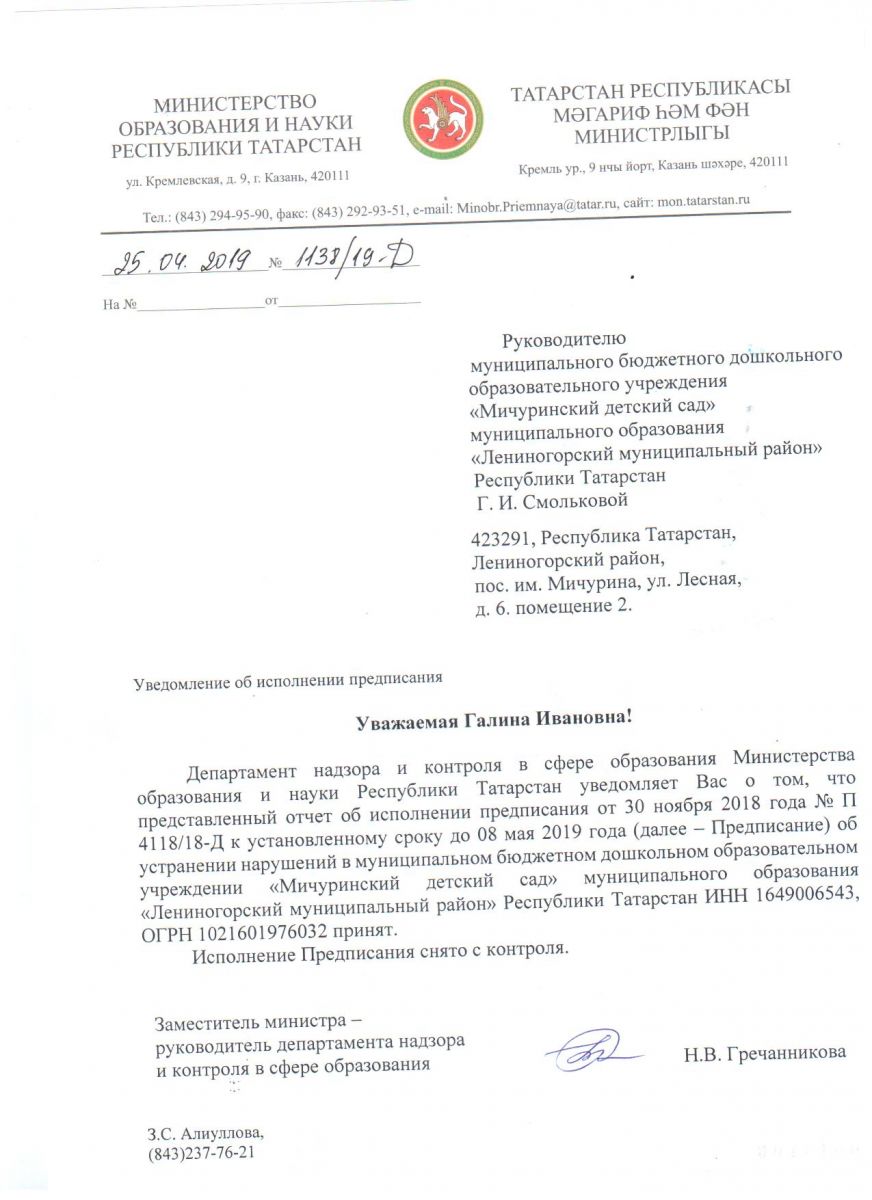 Уведомление об исполнении предписания от 25.04.2019г. №1138/19-Д