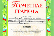 08.05.2015 27 апреля в г. Казань прошла республиканская олимпиада по математике среди студентов 1 курса. Наш студент Речапов Сафар (гр СЭН-14) занял почетное II место. Молодец! Поздравляем победителя и его преподавателя Лукманову Ф.З. Желаем дальнейших побед!