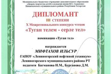 Сәнгатьле сөйләм яратучы, шигырь сөюче «Без-татарлар» шигыре белән Мифтахов Илсур (ЭП-21 группа) мактаулы 3 нче урынны алды (җитәкчеләре Баһманова Наилә Мөдәрис кызы, Борһанова Дилә Мөҗәһит кызы). Котлыйбыз!