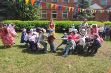 Дети активно участвовали в играх – соревнованиях: «Бег с ложками», «Разбивание горшка», «Перетягивание каната», пели песни, читали стихи и дружно танцевали.