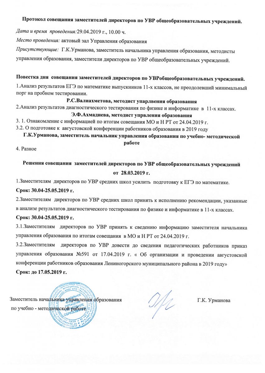 Протокол совещания заместителей директоров по УВР ОУ 28.03.2019г.