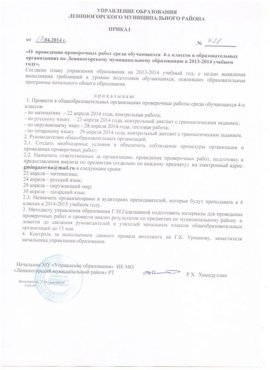 Приказ о проведение проверочных работ по предметам в 4 классах