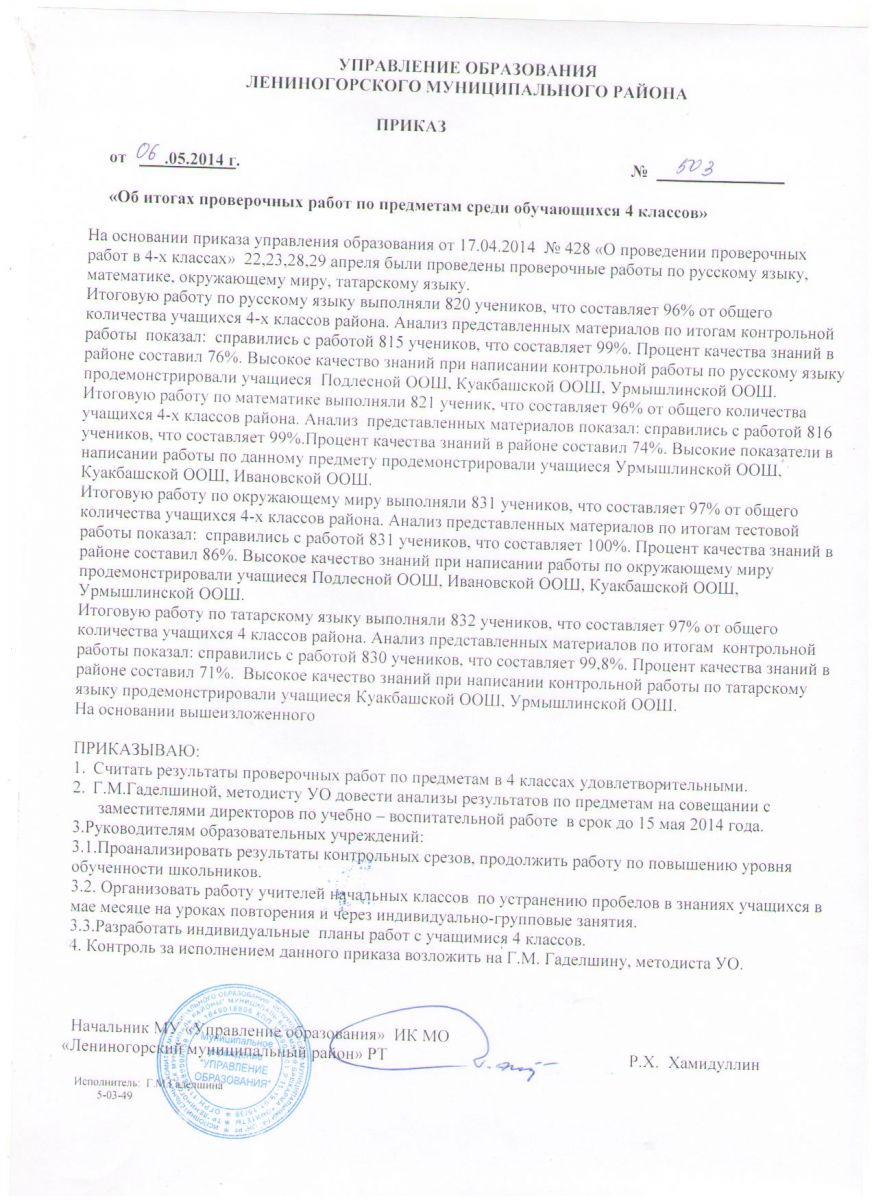 Приказ об итогах проверочных работ по предметам в 4 классах