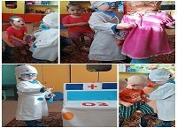 Бүген кече төркемдә балалар белән "Хастаханә" сюжет-роль уены уткәрелде. Балаларда табиб ролен үзенә алырга, тиешле уен гамәлләрен башкарырга өйрәтте. Уенда бер-берсе белән хезмәттәшлек итү сәләтен үстерү һәм сөйләүне, образлы фикерләрне үстерү, балалар сүзлеген активлаштыру максат куелды.