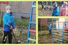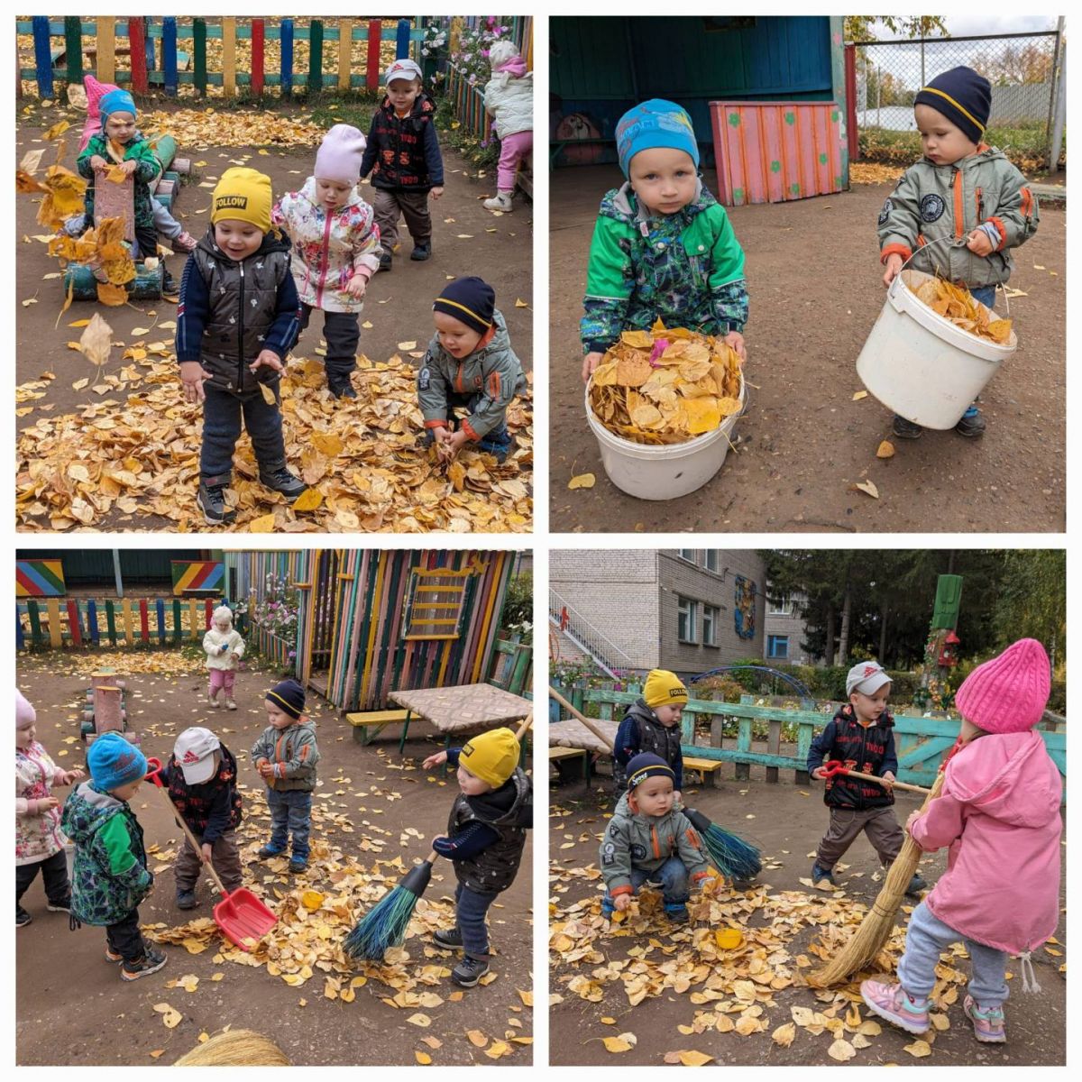 Сегодня на дневной прогулке дети младшей группы под руководством воспитателя принимали участие в очистке участка от осенней листвы.