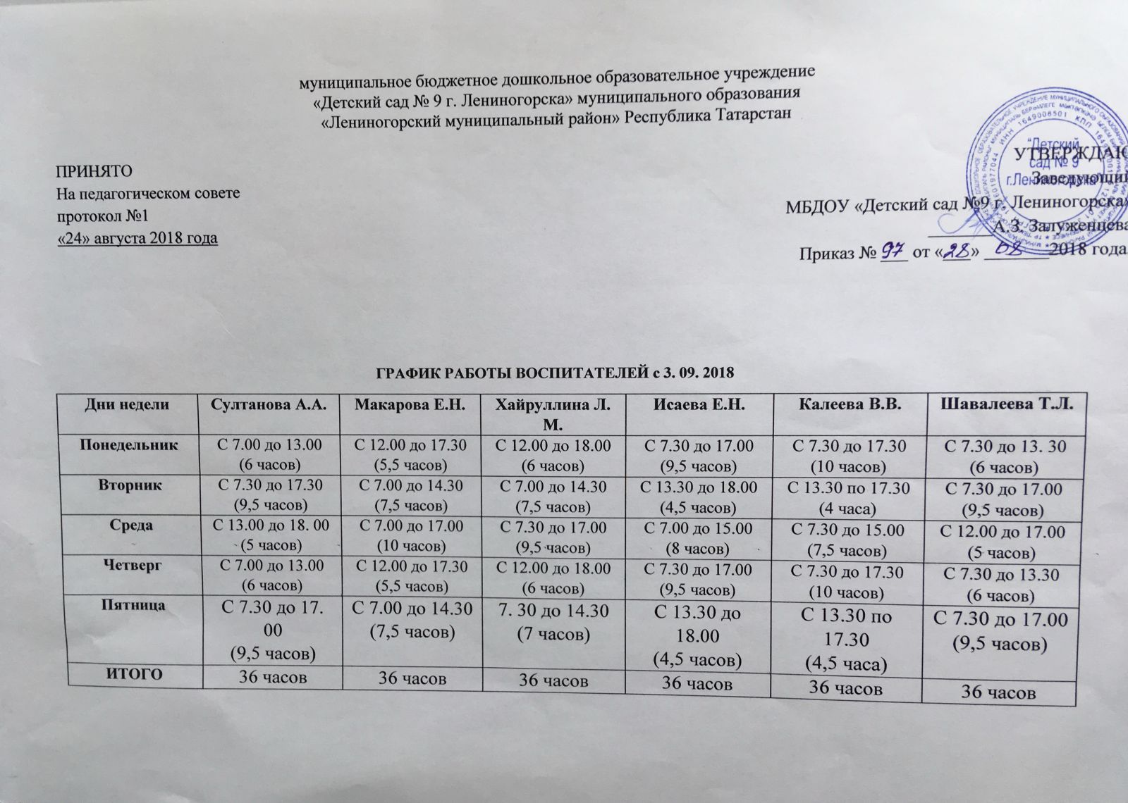 Старший воспитатель: с 8.00 - 17.00 // перерыв на обед 12.00-13.00