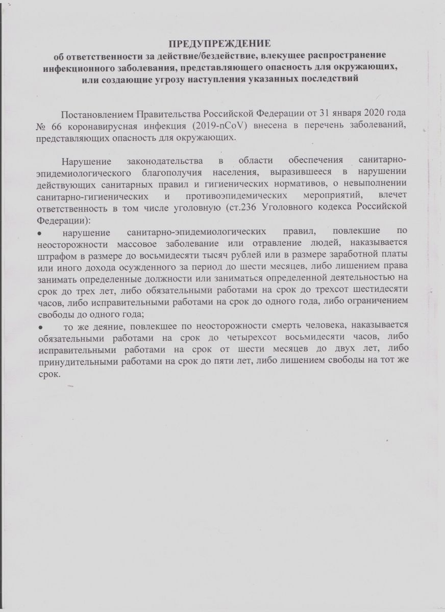 Предупреждение об ответственности за действие/бездействие, влекущее распространение инфекционного заболевания, представляющего опасность для окружающих, или создающие угрозу наступления указанных последствий