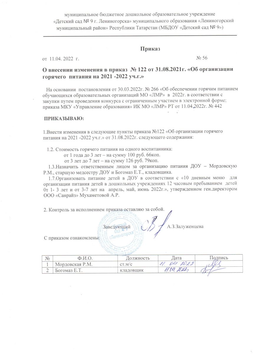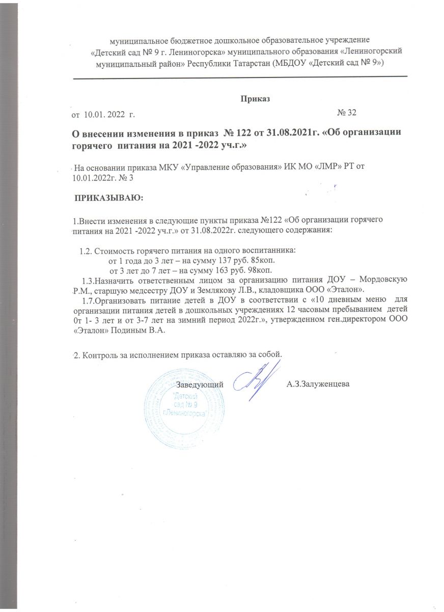 Приказ от 31.08.2021 г. №122 "Об организации горячего питания на 2021-2022 учебный год"