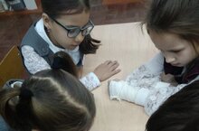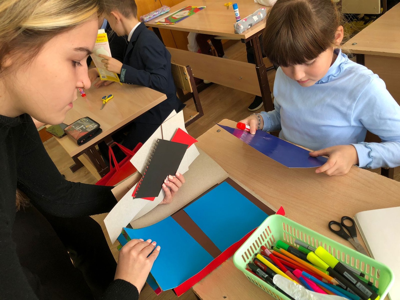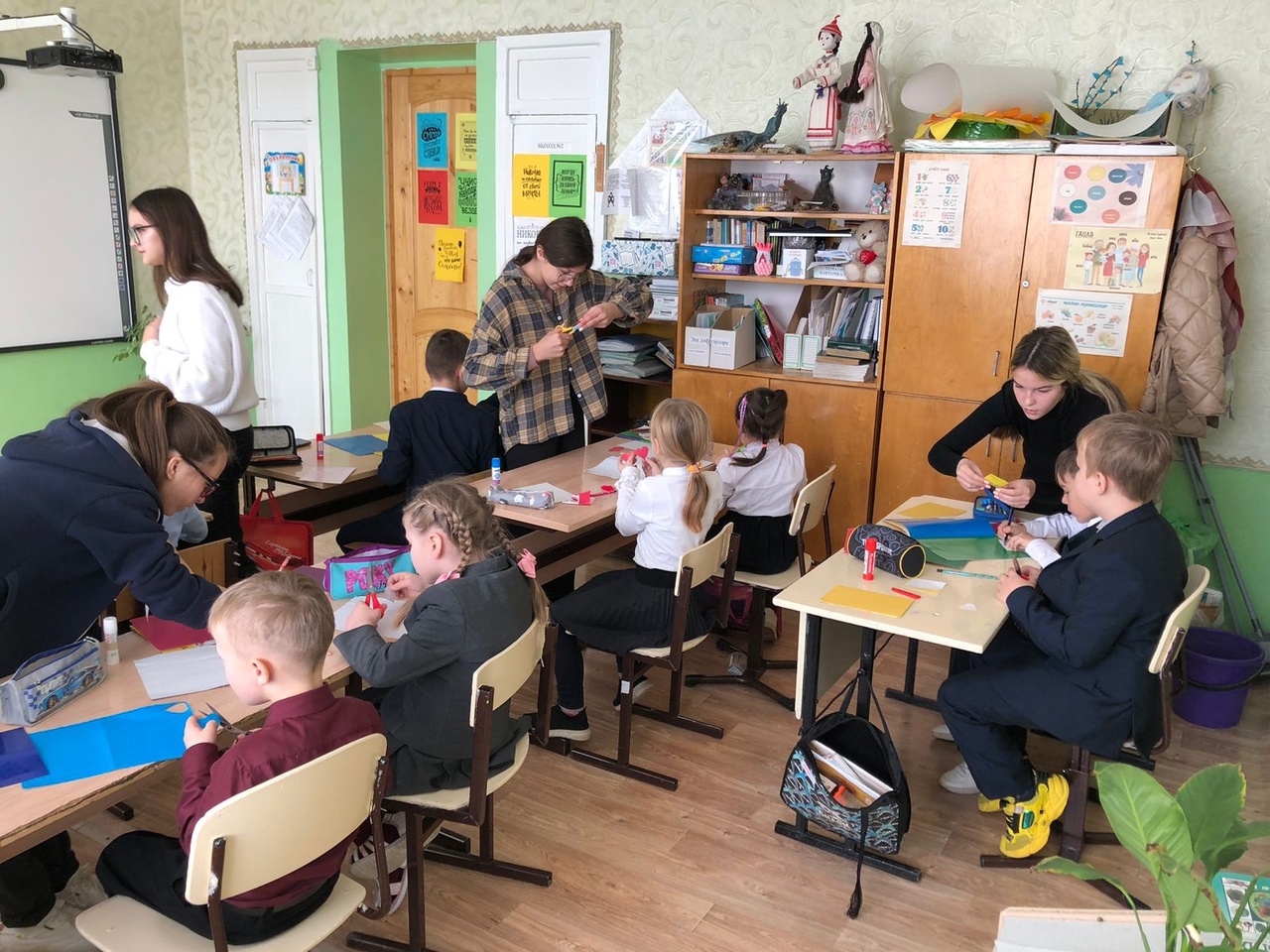 Ученики 9 классов помогали ребятам 1-2 класса создавать открытки, которые они подарят старшему поколению 28 октября.
