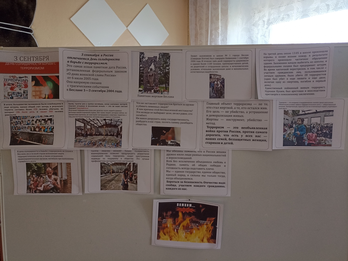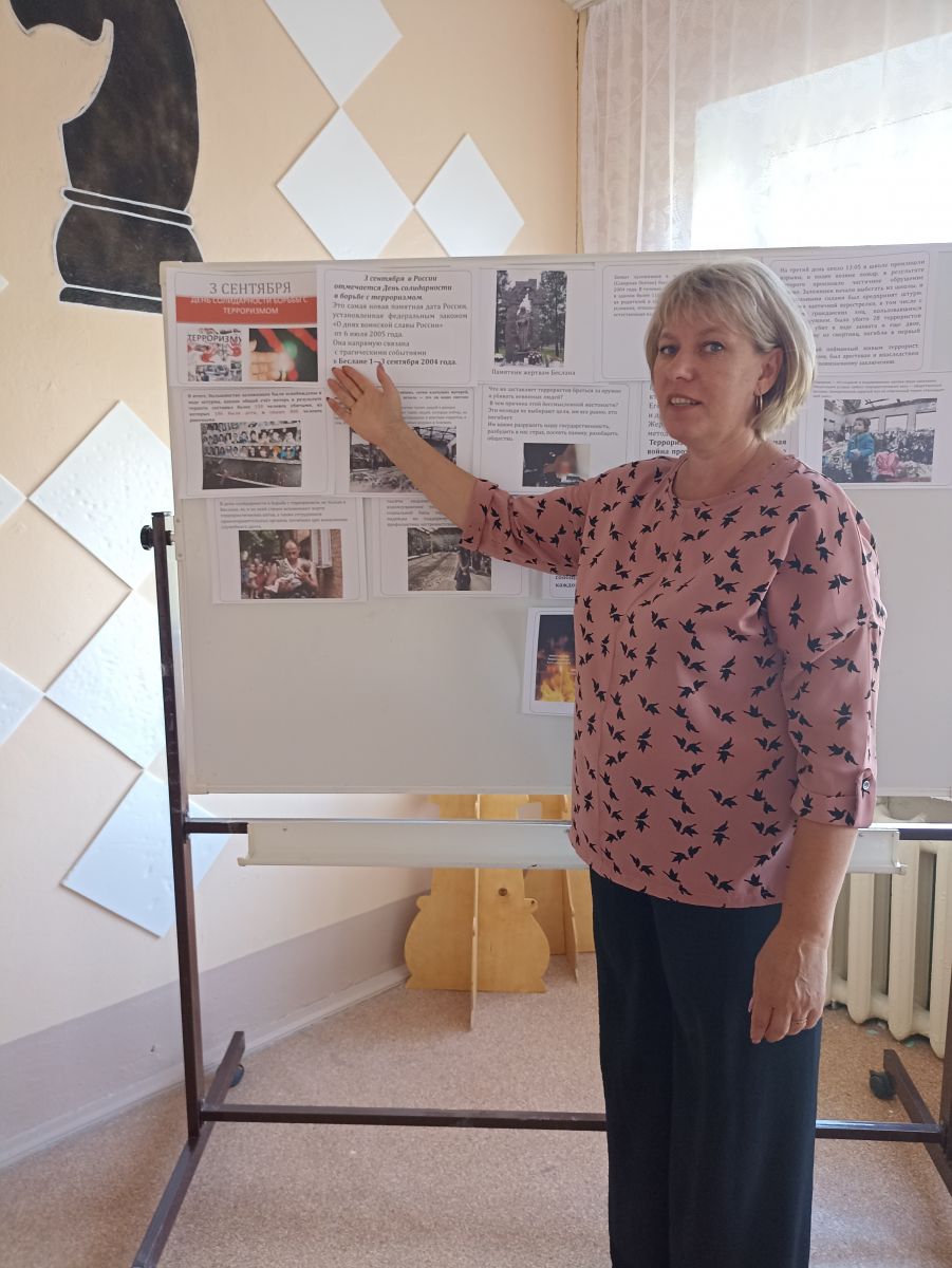 4 сентября советник директора по воспитанию Шилкина Н.В оформила информационный стенд, провела познавательную беседу с учащимися 9 класса, а также провела викторину «Что я знаю о терроризме» в целях противодействия идеологии терроризма, профилактики радикальных проявлений в молодежной среде в сфере этноконфессиональных отношений, создания условий для формирования у молодёжи компетенций в области поликультурного общения