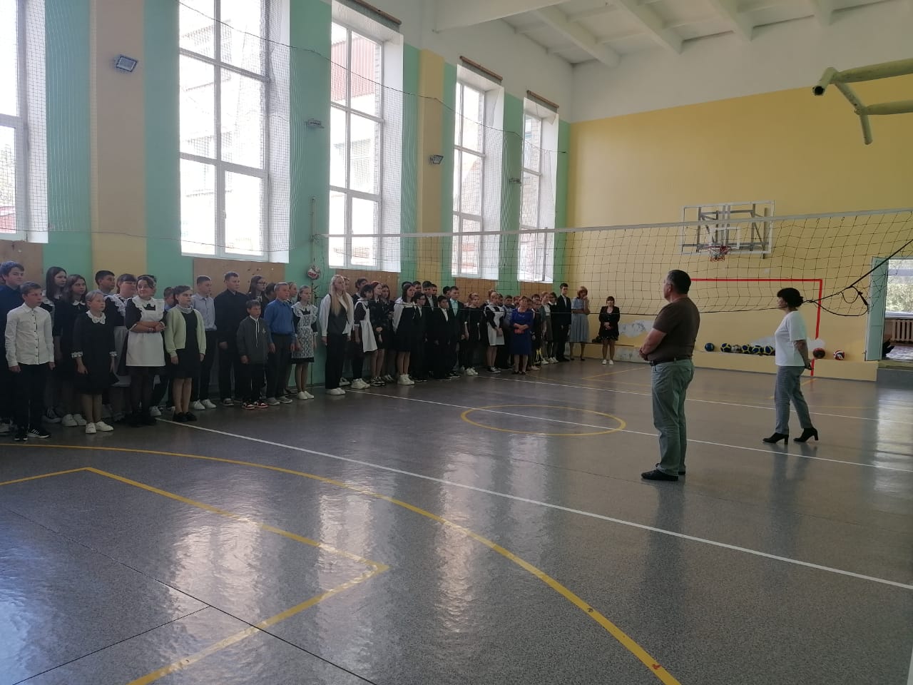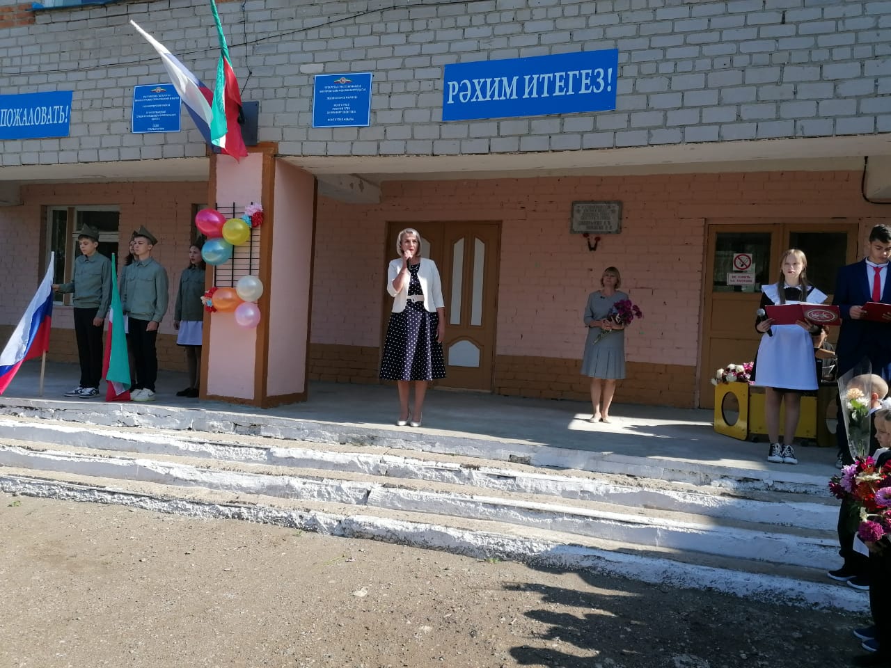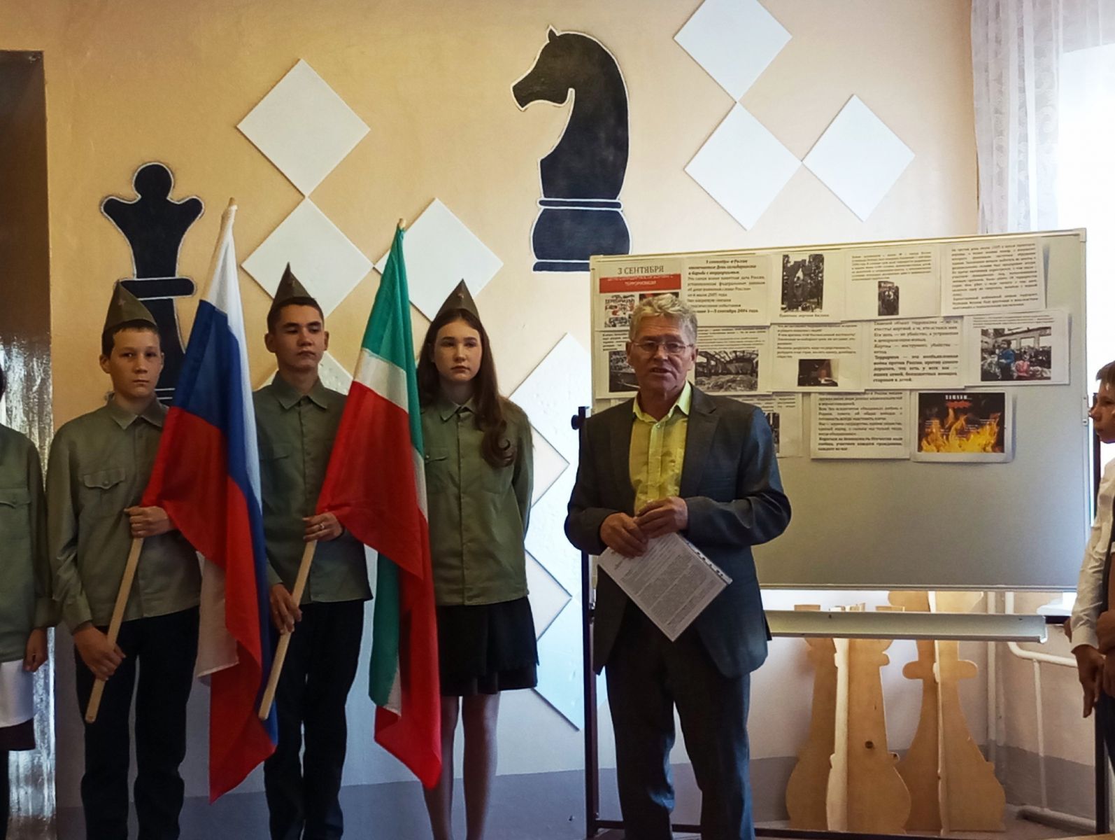 В нашей школе была проведена общешкольная линейка, посвящённая Дню окончания Второй мировой войны и Дню солидарности в борьбе с терроризмом. Линейка началась с выноса флагов РФ и РТ.