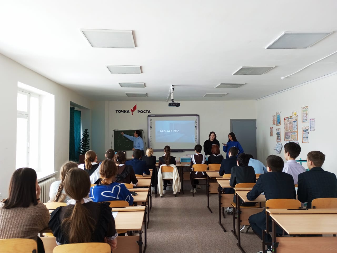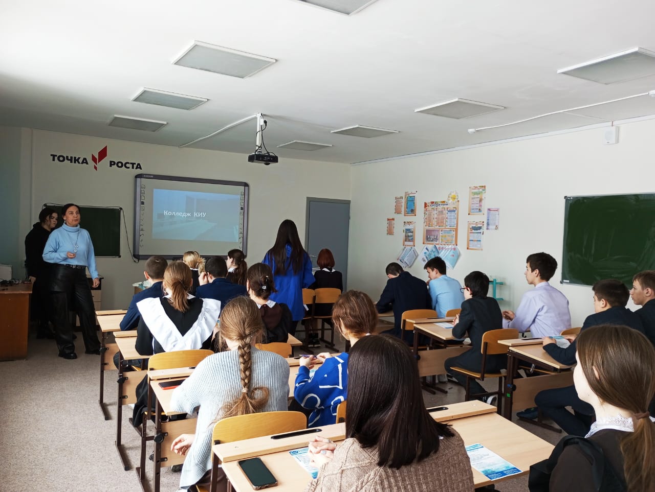 13 февраля школу посетила представитель Колледжа КИУ им. В.Г.ТИМИРЯСОВА (г.Бугульма) кандидат педагогических наук Антонова О.А. Она познакомила учащихся со специальностями которые можно получить обучаясь в колледже, а также с возможностями получения высшего образования. Ребята познакомились со студенческой жизнью в колледже, формами и сроками обучения. Каждый учащийся получил буклет с подробной информацией о КИУ имени В.Г.ТИМИРЯСОВА.