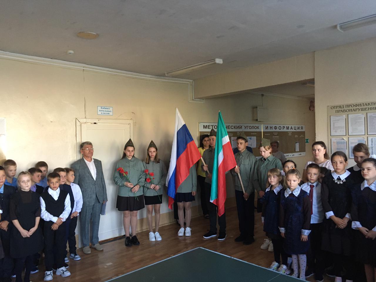 В нашей школе была проведена общешкольная линейка, посвященная Дню окончания второй мировой войны и Дню солидарности в борьбе с терроризмом. Линейка началась с выноса флагов РФ и РТ. Учащиеся прослушали гимны Российской Федерации и Республики Татарстан.