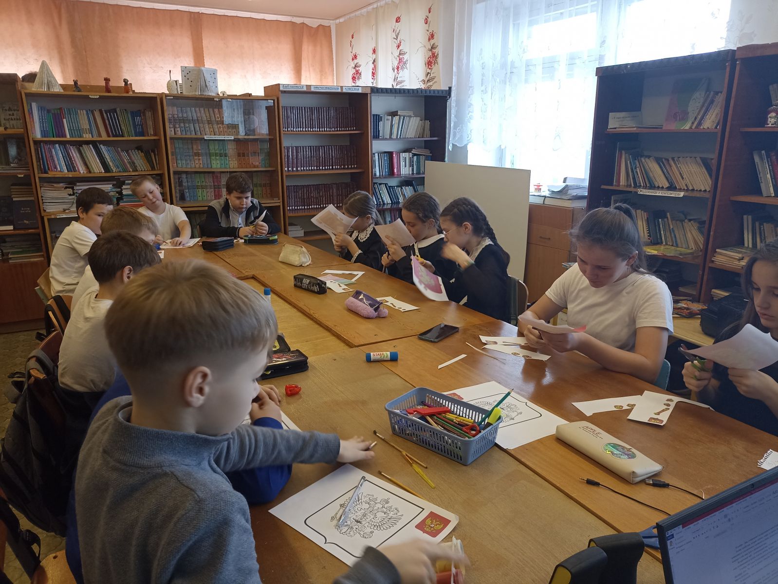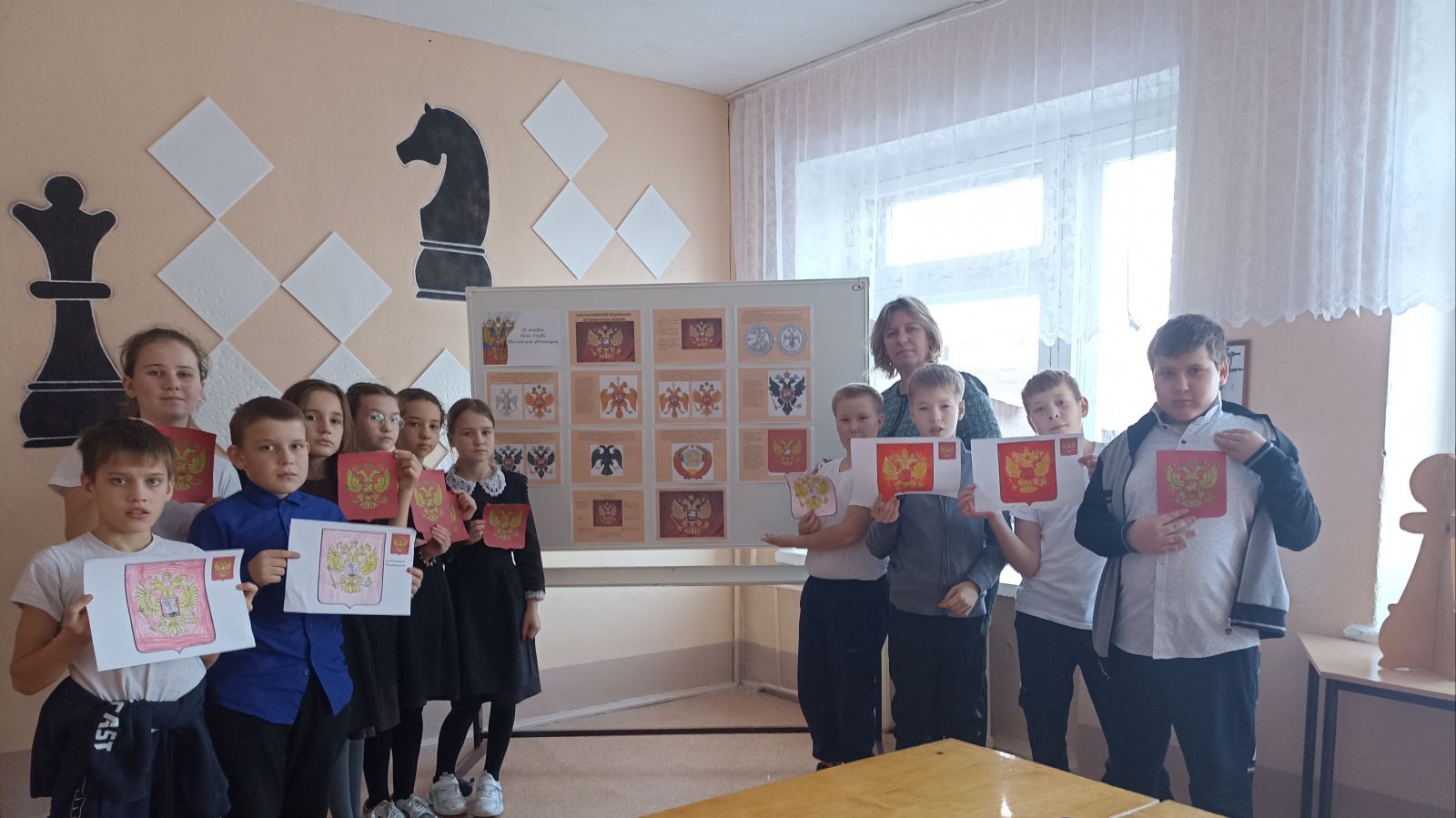 - Коллективное творческое дело «Наш герб», в ходе которого происходило знакомство с геральдикой, раскрылась индивидуальность класса, сплоченность общей идеей. Учащиеся рисовали и изготавливали аппликацию герба Российской Федерации.