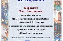 Корсакова Олега, учащегося 6 класса, с призовым 3 местом в муниципальном конкурсе "Юный программист"