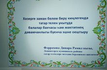 Балалар бакчасы һәм мәктәп арасында дәвамчанлык урнаштыру мәсьәләре турында 25нче октябрь көнне шәһәребезнең 11нче санлы Гимназиясе диварлары артында сөйләштеләр. Бу көнне Гиманазиядә районнардан килгән татар теле методистлары, шәһәребезнең туган (татар) теле буенча тәрбиячеләре һәм укытучылары өчен республикакүләм практик семинар кысаларында ачык , мастер класслар уздырылды. Мәктәбебездән әлеге семинарда татар теле укытучысы, район методик берләшмәсе җитәкчесе Фәррахова Д.Р. катнашты. Ул түгәрәк өстәлгә җыелган хезмәттәшләренә районда туган тел буенча алып барылган бакча-мәктәп элемтәсе арасындагы мөмкинлекләр, эш алымнары һәм методлары турында сөйләде
