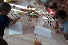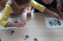 Задача детей была – закрасить весь лист с помощью кисточки. Несколько цветов краски были приготовлены на одной поверхности. Дети макали в краску кисть и делали отпечаток на листе бумаги. Происходило смешивание красок, во время оттиска оставались интересные цветные узоры. Дети проявили инициативу и макали кисть в краску самостоятельно.